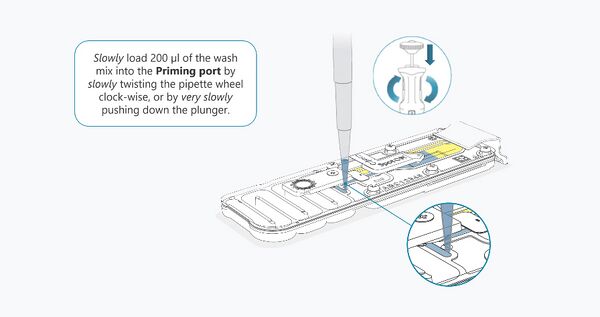 5. Once the 5 minute incubation is complete, carefully load the remaining 200 μL of the prepared flow cell wash mix into the priming port, as follows: