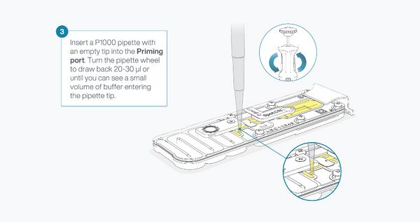 3. Slowly twist the pipette wheel down to load the flow cell (if possible with your pipette) or push down the plunger very slowly, leaving a small volume of buffer in the pipette tip.